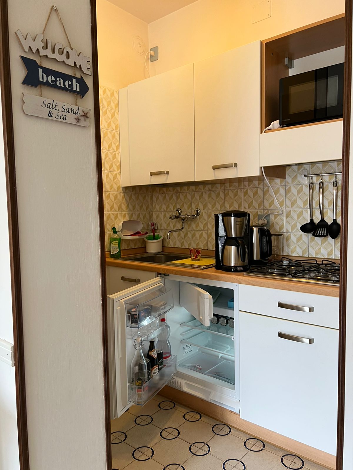 - Kühlschrank, Gasherd, Mikrowelle, Kaffeemaschine, Wasserkocher und Nespressomaschine